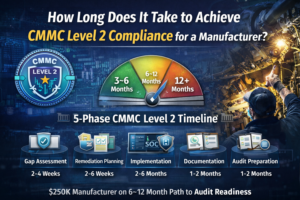 How Long Does It Take to Achieve CMMC Level 2 Compliance for a Manufacturer? For most aerospace and DoD supply chain manufacturers with 25–250 users, achieving CMMC Level 2 compliance